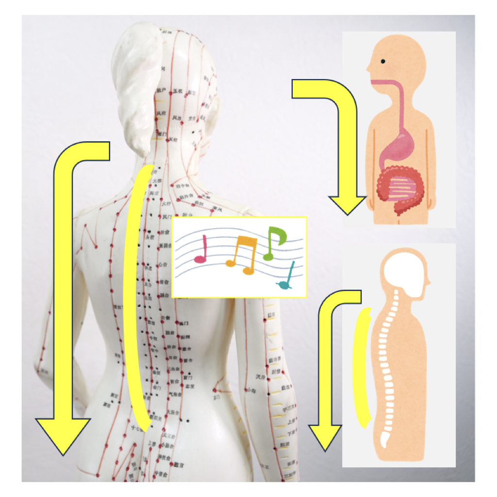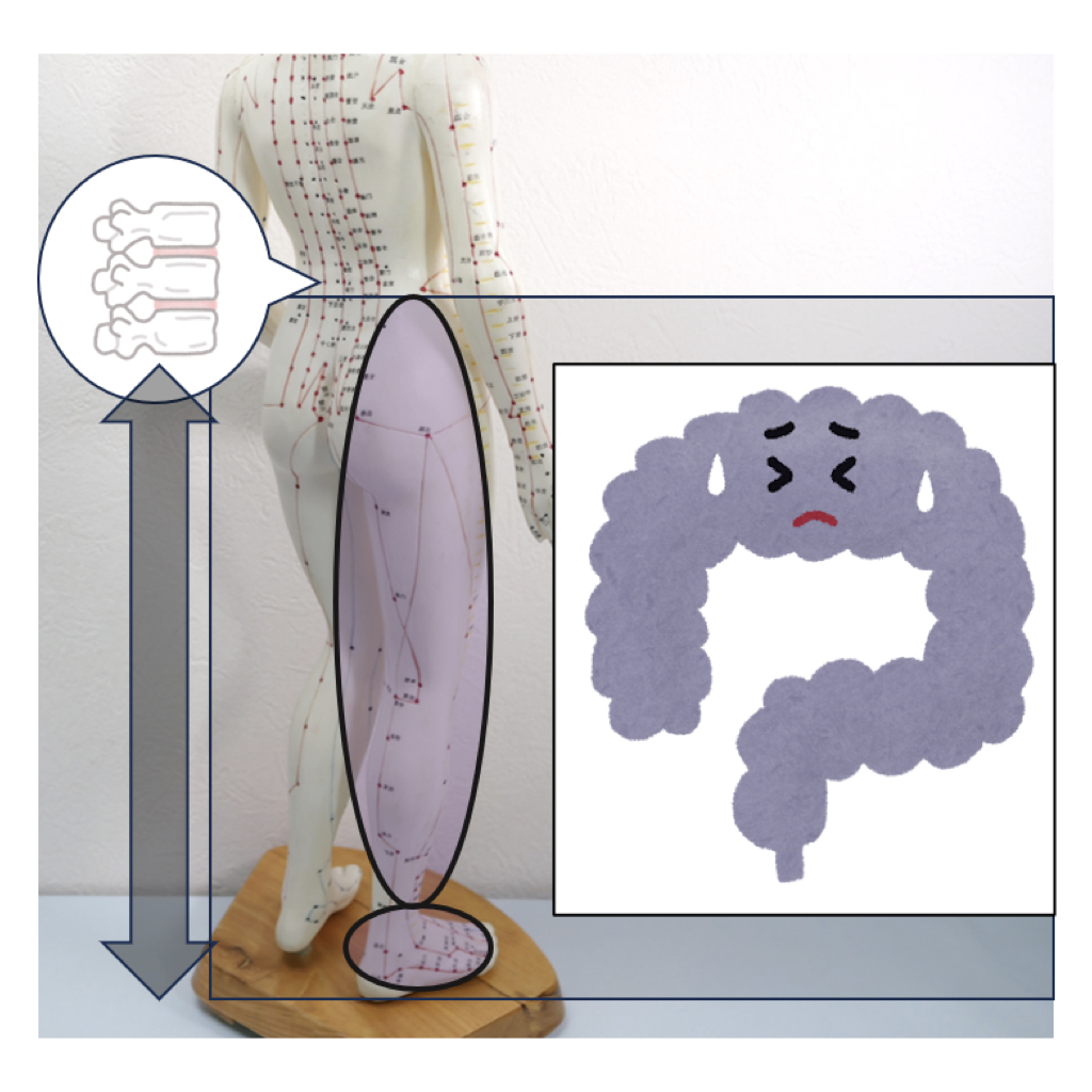 大腸は腰の骨につながっているので、腰や脚、足首の動きが滞ると、便通や腸の粘膜の状態に影響します。腰から足先への施術により、大腸の働きや血流を改善します。