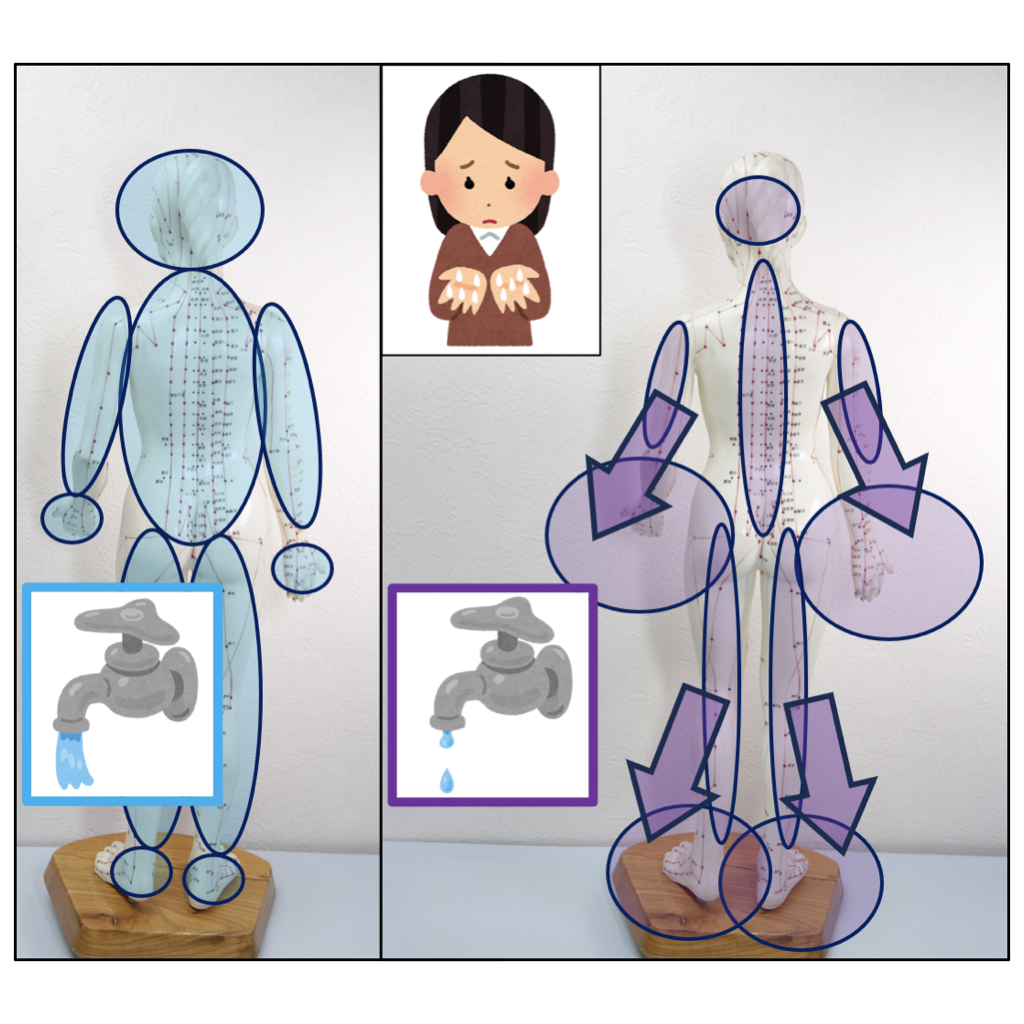 手足の多汗は、手足以外の皮膚の汗腺が十分に開いていないため、手足に発汗が集中している状態と考えられます。腕や脚、頭皮、背中などの汗腺を開く施術により、手足への発汗の集中を緩和します。