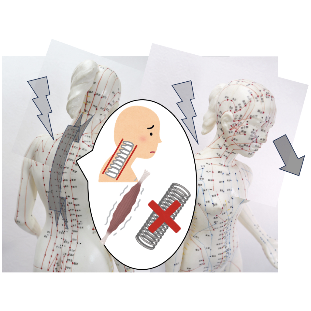 鍼で背中と首の筋肉を刺激してバネ機能を回復し、姿勢を改善します。