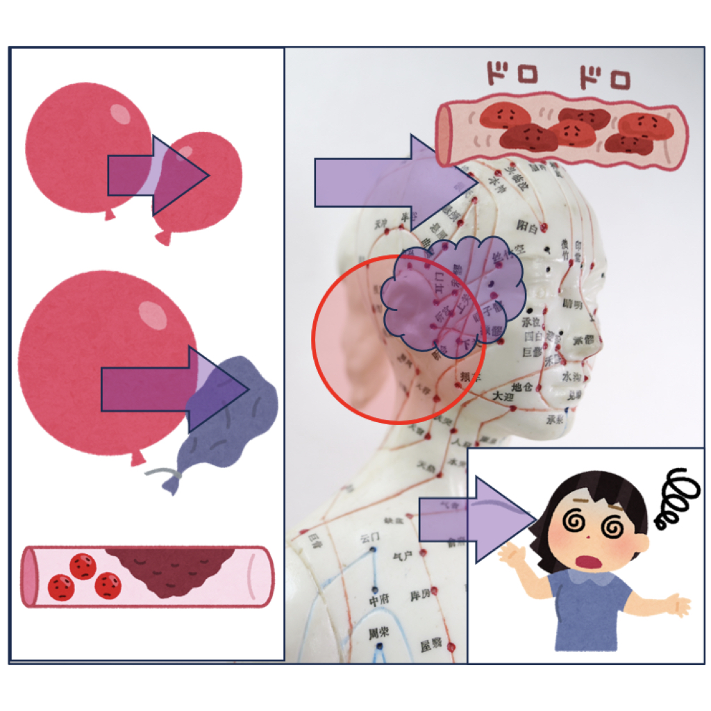 内耳のリンパの圧迫・停滞を緩和 耳や顎の周りの血管やリンパが詰まって圧力が高まると、内耳のリンパが圧迫されて流れが滞り、めまい・耳鳴りの原因に。