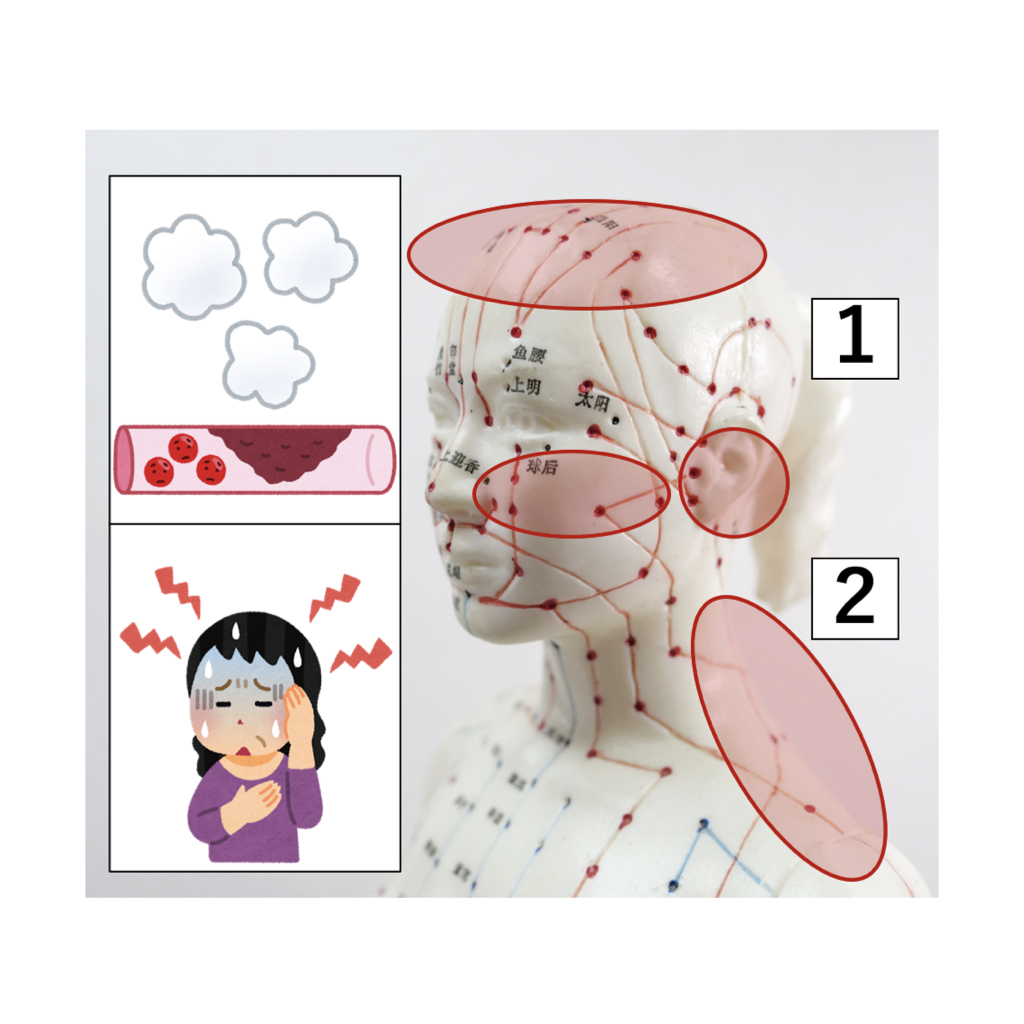 血の道の不調と呼ばれるように、鬱血による熱の蓄積が原因で、のぼせ・ホットフラッシュなどが発生。顔周りの問題には、1.耳や頬、頭頂部に、動悸・息切れには、2.首~背中に施術します。