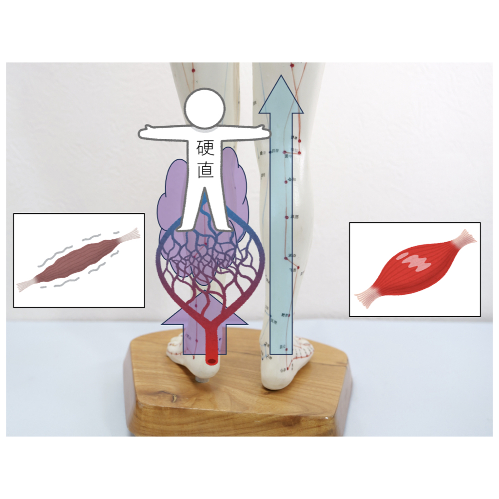 脚の静脈がコブ状に膨れる原因は、ふくらはぎなどの筋肉が硬直して血流を妨げていることです。鍼で筋肉を深層からほぐして血流を改善し、皮膚の静脈の膨隆を和らげます。