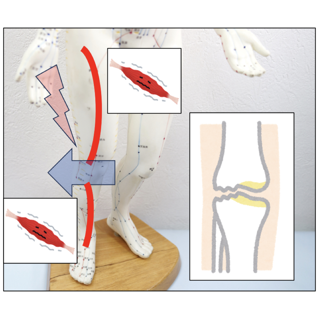 膝周りの筋肉が硬直すると、膝の関節にストレスが掛かり、変形や痛みの原因になります。詰まりや引っ掛かりがあるポイントを鍼灸でほぐして、関節の動きを真っ直ぐに整えます。