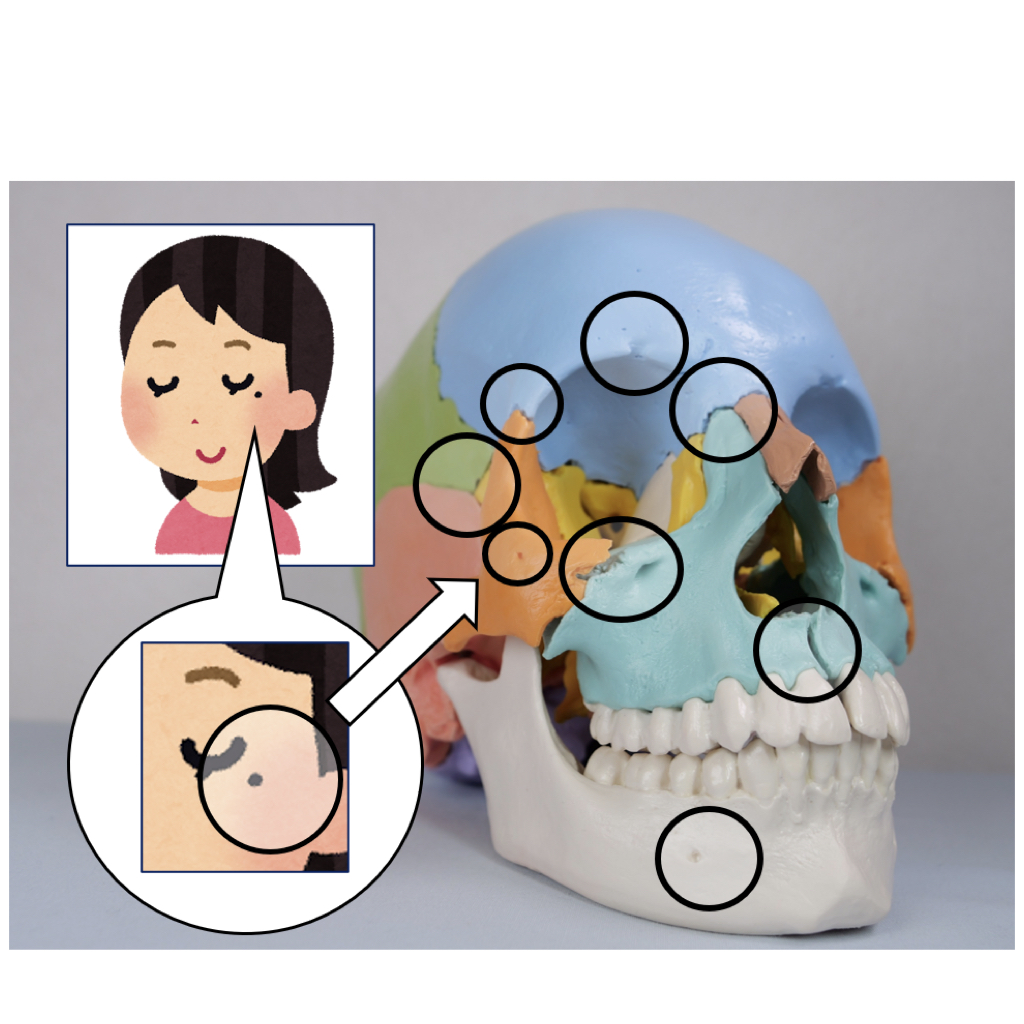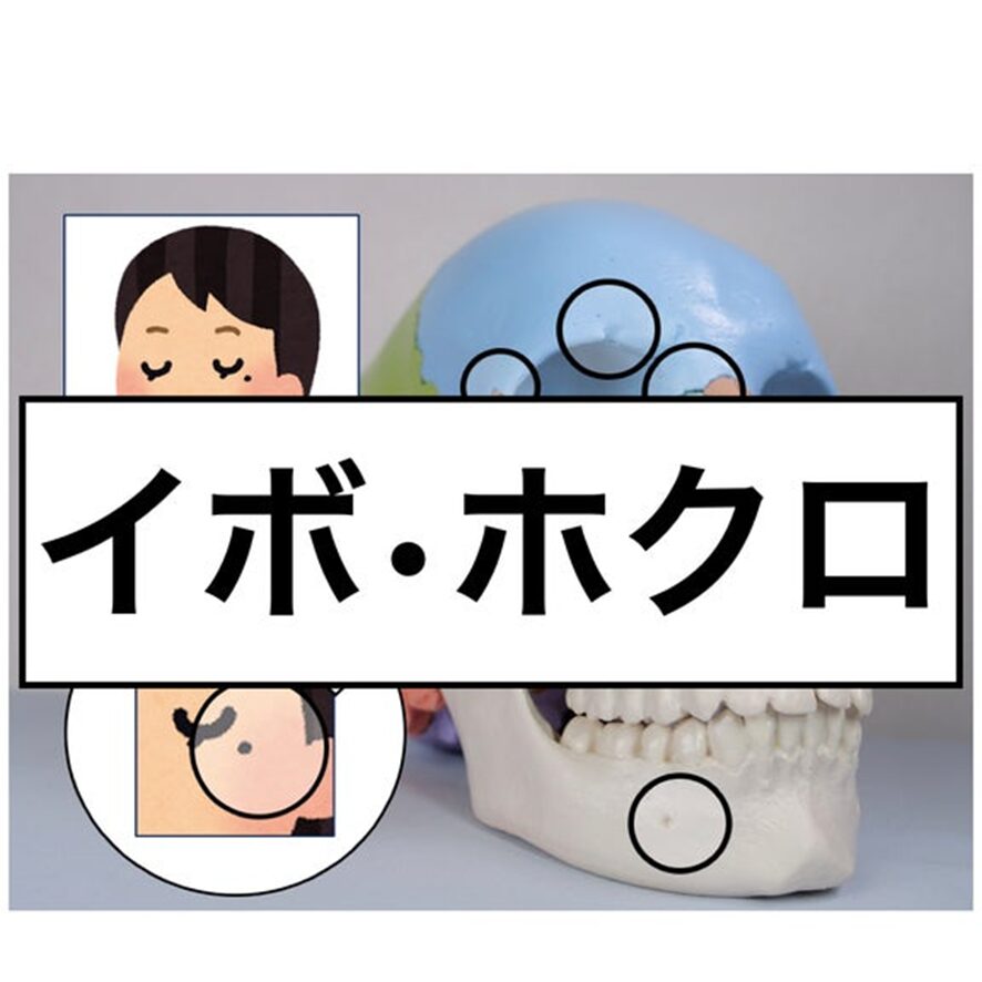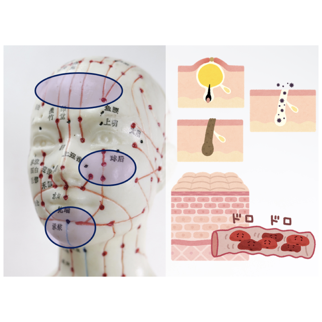 目の上、こめかみ、頬、顎先など、頭蓋骨の継ぎ目や血管の通り道の周囲は、老廃物が溜まりがち。 鍼灸で皮膚・筋肉からの老廃物の排出を促進し、イボ・ホクロ・くすみ・黒ずみを改善。