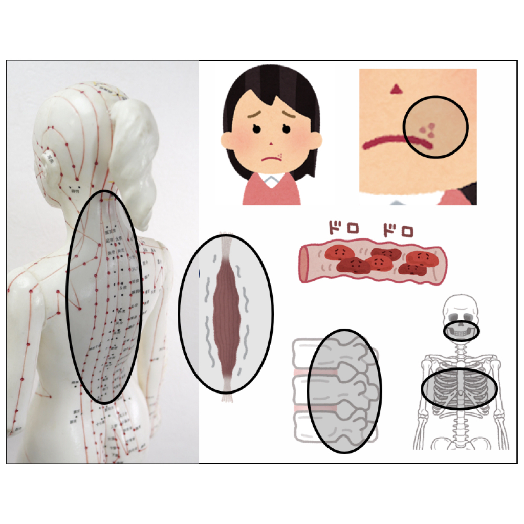 五十肩、ギックリ腰、脊柱管狭窄症、ムチ打ち、猫背、側弯、歩行障害、静脈瘤、チック、吃音、噛合せ不良、歯ぎしり、顔の歪み・シワ・たるみ・ほうれい線…etc.